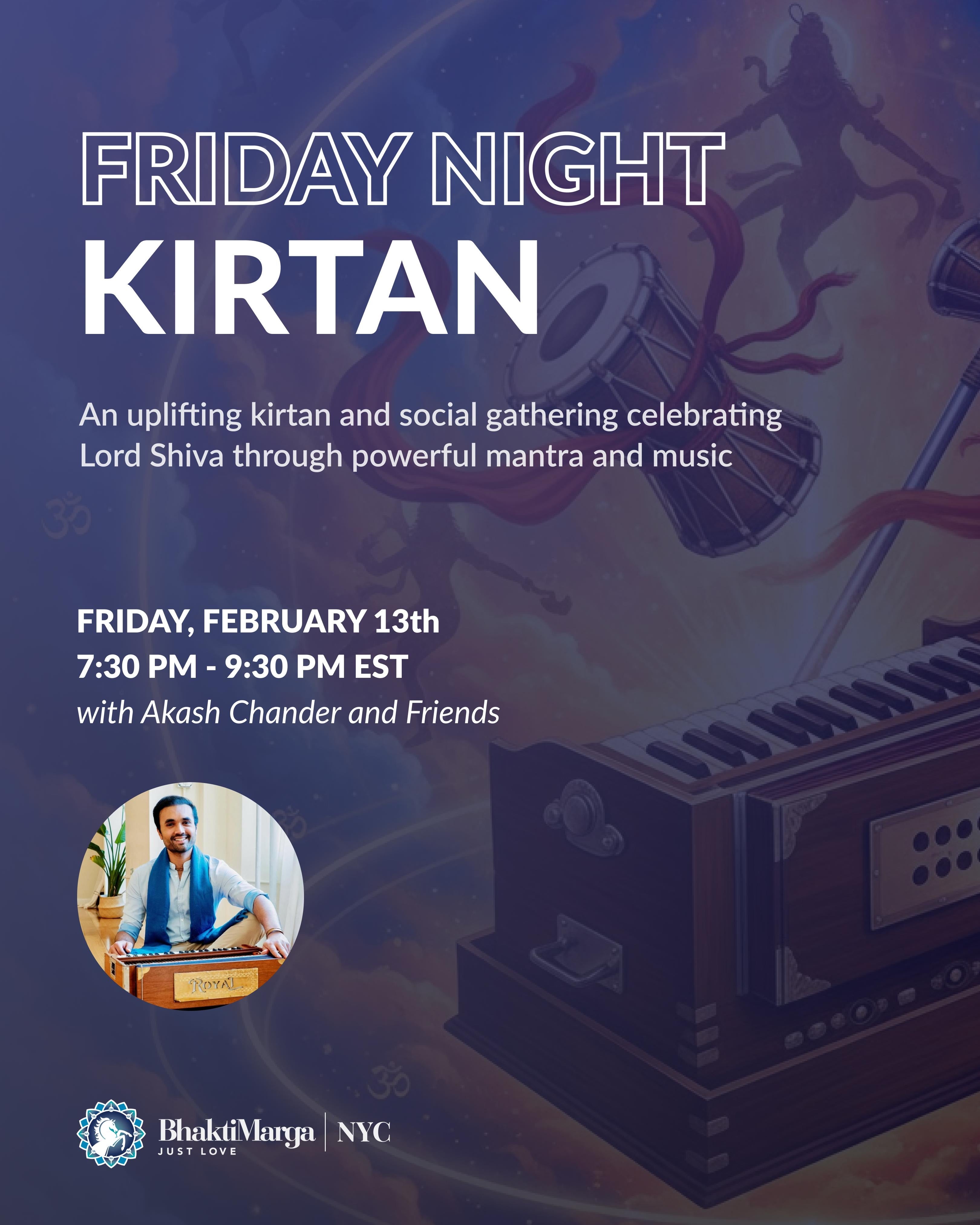 Join us for a joyful Friday night kirtan, an uplifting gathering of call-and-response chanting rooted in the bhakti tradition of devotional love. This Friday we are dedicating kirtan in celebration of Lord Shiva and Maha Shivaratri.